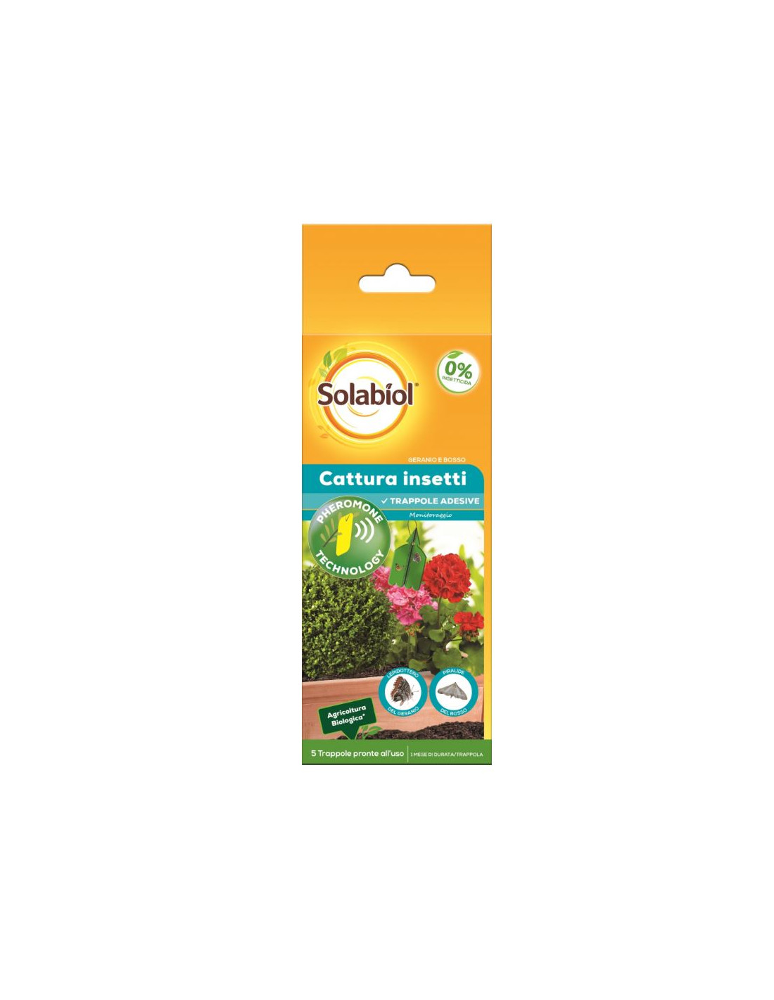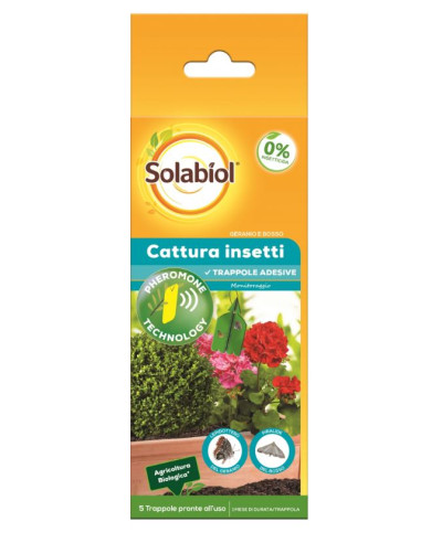 La trappola adesiva Cattura Insetti è l'innovativa soluzione naturale per la cattura ed il monitoraggio del lepidottero del geranio (Cacyreus marshalli) e della piralide del bosso (Cydalima perspectalis). La trappola richiama naturalmente gli insetti nocivi per il geranio grazie al suo colore verde; l'azione cromotropica, combinata con la presenza del feromone di attrazione specifico, la rende inoltre particolarmente adatta al monitoraggio degli insetti nocivi per il bosso. La trappola è resistente alla pioggia e agli agenti atmosferici, garantendo fino a un mese di efficacia.