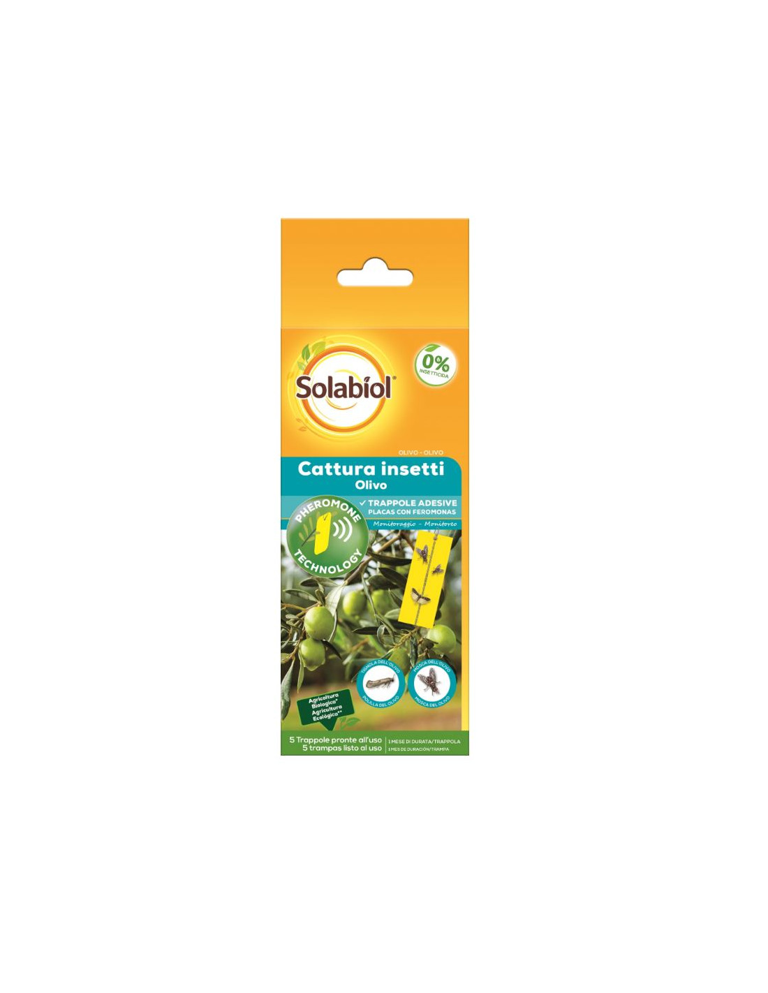 La trappola adesiva Cattura Insetti è l'innovativa soluzione naturale per la cattura ed il monitoraggio della mosca dell'olivo (Bactrocera oleae) e della tignola dell'olivo (Prays oleae). La trappola, oltre a richiamare naturalmente gli insetti grazie al suo colore giallo, contiene anche i 2 feromoni di attrazione specifici per gli insetti bersaglio che vengono quindi attirati e catturati nel foglio adesivo. La trappola è resistente alla pioggia e agli altri agenti atmosferici, garantendo fino a un mese di efficacia.