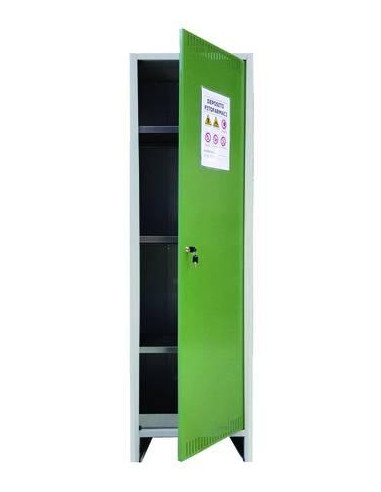 componibile in kit di montaggio - in acciao 10/10mm - verniciatura colore verde - etichetta adesiva conforme alla normativa - 3 mensole forate in lamiera zincata - 1 vaschetta di raccolta per sversamento accidentale, capacità lt.11 in lamiera zincata - sistema di aerazione - segnalazioni di pericolo - porta con un battente - chiusura con chiave - peso Kg.19