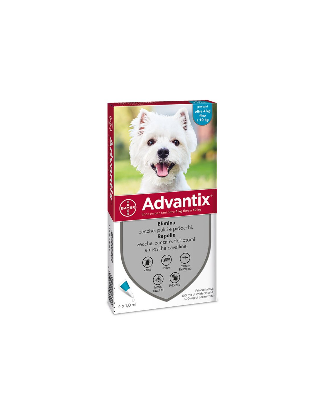 Advantix non solo elimina pulci e zecche nei cani, ma ha anche un effetto repellente nei confronti di zecche, zanzare e flebotomi.Advantix è efficace anche contro le larve di pulce presenti nell'ambiente circostante il cane trattato.BENEFICI DI ADVANTIX ANTIPARASSITARIO PER CANIImpedisce alle pulci di pungere e quindi le elimina. Le pulci sul cane sono uccise entro un giorno dal trattamento. Imidacloprid, uno dei due principi attivi contenuti in Advantix è attivo anche contro le larve di pulce presenti nell'ambiente circostante dopo l'applicazione sull'animale. Advantix è indicato anche per il trattamento dei pidocchi nel cane.Repelle le zecche e uccide quelle venute a contatto con la cute, riducendo il rischio di trasmissione di malattie come Ehrlichiosi, Rickettsiosi e Borreliosi.Riduce il rischio di malattie come la LEISHMANIOSI e altre malattie trasmesse da vettore grazie all'effetto repellenteAttivo contro  pulci, zecche, zanzare, pappataci e mosca cavallina