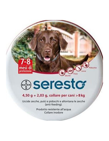Seresto è un collare antiparassitario contro pulci e zecche con alcune caratteristiche particolari. Usa una combinazione innovativa di materiali che permette di rilasciare in modo controllato dosi basse dei principi attivi fino a 8 mesi. Ciò offre un'elevata protezione del cane che non è limitata alla sola uccisione di pulci e zecche, ma agisce anche repellendo le zecche prima che possano pungere, cosa che facilita la protezione dell'animale contro le malattie trasmesse da questi parassiti.