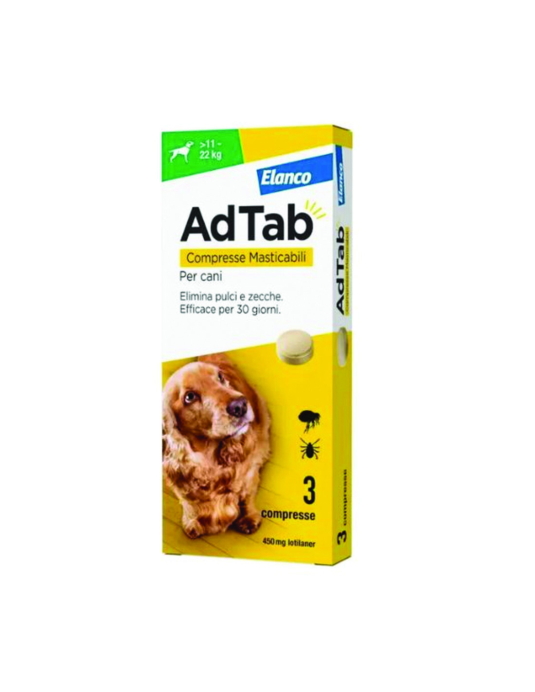 ADTAB COMPRESSE MASTICABILI PER CANI KG.11-22 3 compresse da mg.450 di lotilaner elimina pulci e zecche rapidamente, le pulci vengono eliminate prima che possano deporre le uova - efficacia persistente per 1 mese - previene le infestazioni da pulci in casa nell'ambiente dove ha accesso l'animale - si può somministrare con il cibo o entro 30 minuti dal pasto - confezione da 3 compresse masticabili a base di lotilaner (il lotilaner è un principio attivo altamente selettivo, con un'affinità esclusiva sui recettori GABA di insetti e acari)