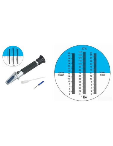 RIFRATTOMETRO MANUALE PORTATILE TRIPLA SCALA Scale 0-32% Brix/ 0-140° Oechsle/ 0-27° Babo Risoluzione: 0,2% Brix/ 1° Oe/ 0,2 kmw Babo Realizzato appositamente per misurare il contenuto di zucchero nel succo d'uva! COMPENSAZIONE AUTOMATICA DI TEMPERATURA 20°C Molto semplice da usare: si pone una goccia del campione sul prisma e si legge immediatamente il risultato sulla scala. Gli strumenti hanno la focale regolabile, forniscono letture dirette e possono misurare concentrazioni di molti liquidi zuccherini come il succo d'uva o altri succhi di frutta (es. kiwi). I modelli con la compensazione automatica della temperatura (ATC) sono adatti per applicazioni dove la temperatura del campione varia. Tutti i rifrattometri sono forniti completi di custodia rigida, pipetta dosatrice e manuale di istruzioni. Ottimo rapporto qualità/prezzo! Per il calcolo del grado zuccherino presenti nei liquidi: Uva, Frutta, Succhi. NB: Viene utilizzato in particolare dai viticoltori per individuare il momento migliore per la raccolta dell'uva in modo da ottenere un prodotto di qualità superiore e con il maggior grado alcolico (inviamo anche tabella lettura grado brix succo d'uva >>> contenuto in alcool probabile del futuro vino)