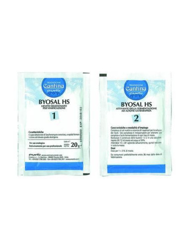 una bustina gr.20 lievito secco selezionato e una bustina gr.20 attivante di fermentazione entrambi predosati per la fermentazione di 1hl di mosto - l'impiego contemporaneo del lievito selezionato e dell'attivante di fermentazione consente una facile e completa fermentazione di ogni tipo di mosto - BYOSAL è particolarmente utile nei casi in cui si debbano trattare piccole masse di vino - le dosi preformate da 1hl permettono infatti un dosaggio adeguato e preciso, evitando sprechi di prodotto - regolamento CE 606/2009