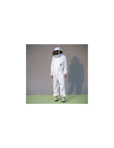Tuta compatta completa di maschera quadrata in tela di cotone bianca con elastici ai polsi e alle caviglie, con lunga chiusura a cerniera ed ampie tasche taglie s, m, l, xl, xxl. La maschera si aggancia alla tuta per mezzo di un elastico e di un particolare collo imbottito. In questo modo la maschera viene inserita soltanto quando si lavora con le api, a tuta già indossata.