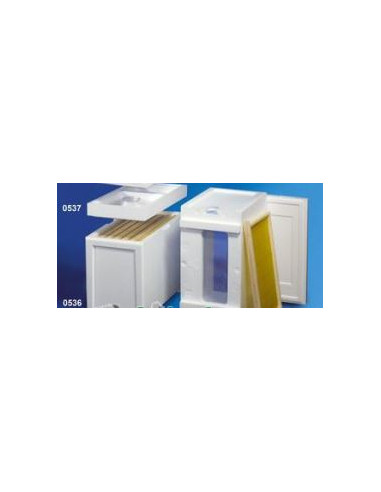 Cassettino portasciame in polistirolo espanso ad alta densità con fondo in rete per 6 favi da nido con distanziatori. Rispetto alla foto, non sono compresi: tetto in lamiera, coprifavo con nutritore e telini cerati. Le dimensioni della rete del fondo sono circa cm. 30x12