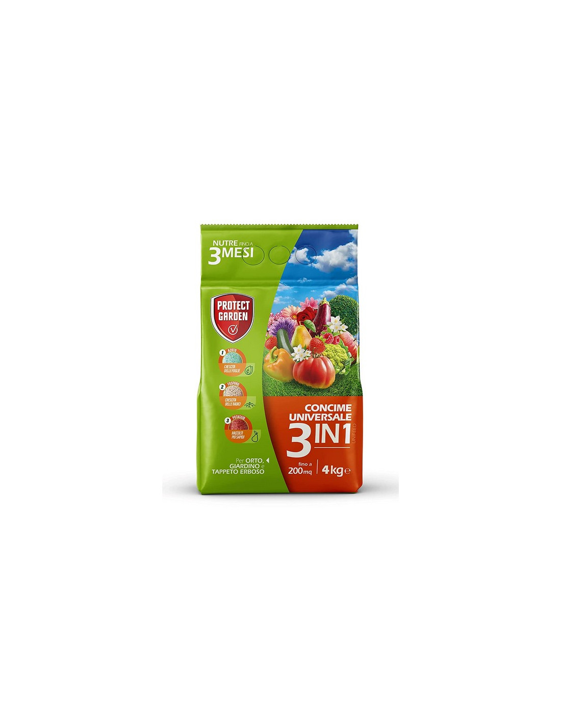 - PROTECT GARDEN CONCIME GRANULARE UNIVERSALE 3in1 A LENTA CESSIONE NUTRE FINO A 3 MESI. PER ORTO&FRUTTA, PIANTE FLOREALI, ORNAMENTALI E TAPPETO ERBOSO 4Kg FORMULAZIONE 3in1 – ricca di Azoto per favorire la crescita di foglie sane e verdi, Fosforo per promuovere la crescita radicale e Potassio per frutti e fiori abbondanti TECNOLOGIA NBPT (inibitore della nitrificazione) – per rallentare il processo di mineralizzazione dell’azoto ammoniacale, rendendo il nutrimento per la pianta gradualmente disponibile fino a 3 mesi 3 MESI DI NUTRIZIONE – con una sola applicazione di Protect Garden Concime Universale 3in1 per una nutrizione bilanciata e duratura senza il pericolo di bruciature CALCIPRILL – Supporto a base di Calcio totalmente idrosolubile e 100% biodegradabile con ruolo nutritivo e stabilizzatore del pH del suolo ZOLFO – formulazione arricchita con zolfo per rinforzare la pianta, rendendola meno suscettibile agli stress