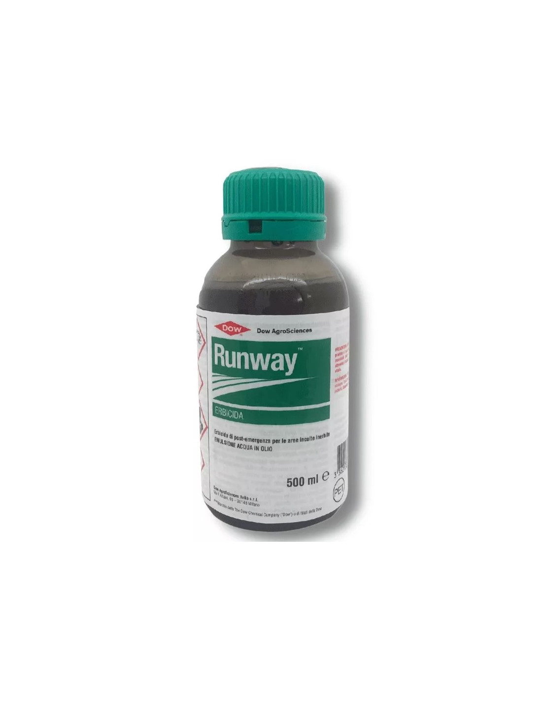 E` un erbicida che agisce principalmente per assorbimento fogliare e, una volta assorbito e traslocato all’interno della pianta, controlla infestanti a foglia larga erbacee (siano esse dicotiledoni che monocotiledoni non graminacee), arbustive e legnose in Aree rurali ed industriali, Aree ed Opere civili, Sedi ferroviarie, Argini di canali, Fossi e Scoline. La sua azione si manifesta lentamente, devitalizzando la vegetazione spontanea in un lasso di tempo piu` o meno breve a seconda del tipo di infestante e dello stadio di sviluppo (da 5-7 giorni a 3-4 settimane). Non e` volatile. Per queste ultime sue prerogative, Runway si presta particolarmente per il VM (Vegetation Management o Gestione Integrata dalle Infestanti). Utilizzato da solo, e` selettivo per le graminacee spontanee, evitando l’effetto “vuoto biologico”, vegetazione completamente secca o giallo-arancio che puo` portare all’erosione del suolo ed e` particolarmente inviso ai non addetti del settore.