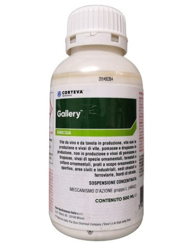 Avvertenze agronomiche: Gallery e` dotato di una grande persistenza d’azione; prima di seminare colture dicotiledoni su parcelle trattate con Gallery, effettuare una prova di selettivita`. Non utilizzare gallery in post-semina pre-emergenza di specie ornamentali o forestali. Non applicare Gallery su Ajuga spp., Iberis spp., Brassica spp., Sedum spp. e Euphorbia spp.. Non applicare Gallery su terreno (pieno campo e contenitore) non consolidato o presentante fessure e comunque dopo l’invaso lasciare che il substrato si consolidi per 8-10 giorni. Non utilizzare gallery su specie graminacee coltivate per la produzione di semente e su prati in corso di assestamento. In caso di assenza di precipitazioni procedere ad un’irrigazione di 20-30 mm entro gli 8-10 giorni seguenti l’applicazione. Dopo l’applicazione di Gallery su prati a scopo ornamentale o sportivo non rientrare nell’area trattata prima di 24 ore dal trattamento, segnalando con appositi cartelli il divieto di accesso nelle aree trattate mantenendo tale divieto per 24 ore dopo l’applicazione dell’erbicida.