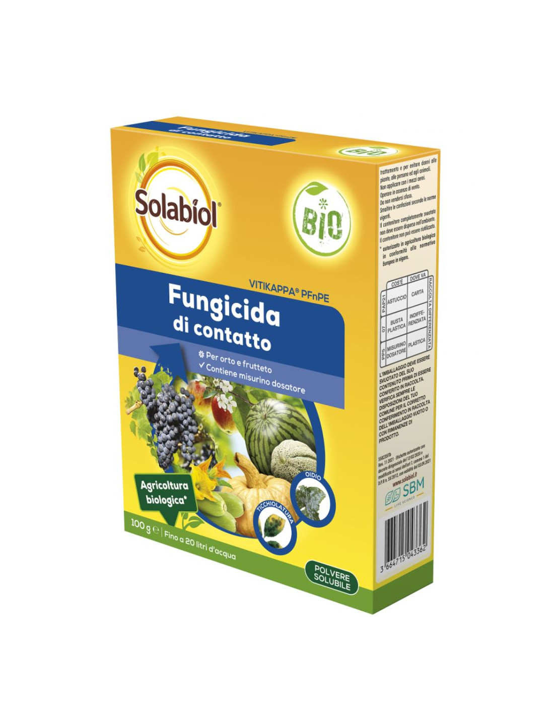 Fungicida Curativo di contatto Naturale Vitikappa è un fungicida di contatto a base di bicarbonato di potassio in cristalli solubili con attività preventiva e curativa contro le maggiori malattie fungine quali ticchiolatura e oidio. Vitikappa ha un modo d'azione multitarget che provoca lo scoppio e il disseccamento e collasso totale funghi patogeni. Vitikappa agisce anche sulla vitalità delle spore fungine risultando idoneo anche per trattamenti invernali. L'elevata purezza del formulato riduce al minimo i rischio di fitotossicità che molto presente invece nei formulati a base di Bicarbonato di Sodio. Fungicida ad ampio spettro d’azione Contiene misurino dosatore Consentito in agricoltura biologica
