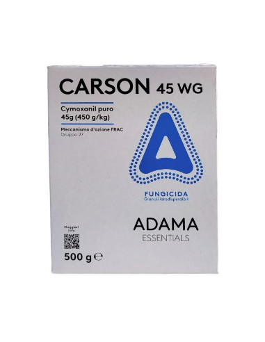 CARSON 45 WG è un fungicida, in granuli idrodisperdibili ad alta concentrazione di cymoxanil, caratterizzato da attività citotropiche e translaminari, particolarmente efficace contro le peronospore della vite, pomodoro (da mensa e da industria) e della Patata. CARSON 45 WG esplica attività preventiva, curativa ed eradicante (potendo controllare infezioni già in atto) con una persistenza d’azione di 4-5 giorni a seconda delle condizioni climatiche che si verificano dopo l’applicazione e dello stato fenologico e di sviluppo delle colture. É sempre consigliabile applicare CARSON 45 WG in miscela con prodotti di contatto e/o endoterapici a diverso meccanismo e modalità d’azione.