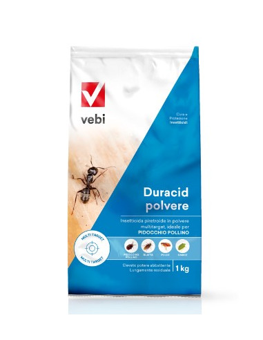 DURACID POLVERE è un insetticida in polvere contro formiche, scarafaggi, cimici, zecche, pidocchio pollino, pulci, acari della polvere, lepisme (pesciolino d’argento), porcellini di terra e mosche. Il prodotto è caratterizzato da un elevato potere abbattente e da un effetto residuale, che protegge gli ambienti da nuove infestazioni.