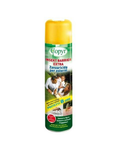 Lo spray Insekt Barrier Extra 600 ml insetticida antizanzara per interni ed esterni di Copyr è un prodotto specifico per proteggere dalle zanzare un’area aperta ove si intende soggiornare per alcune ore. Il primo effetto immediato è quello di uccidere tutte le zanzare presenti nell’area; nelle ore seguenti abbatte o comunque allontana le zanzare che tentano di entrare nella zona trattata, per l’arco temporale di 8 ore.