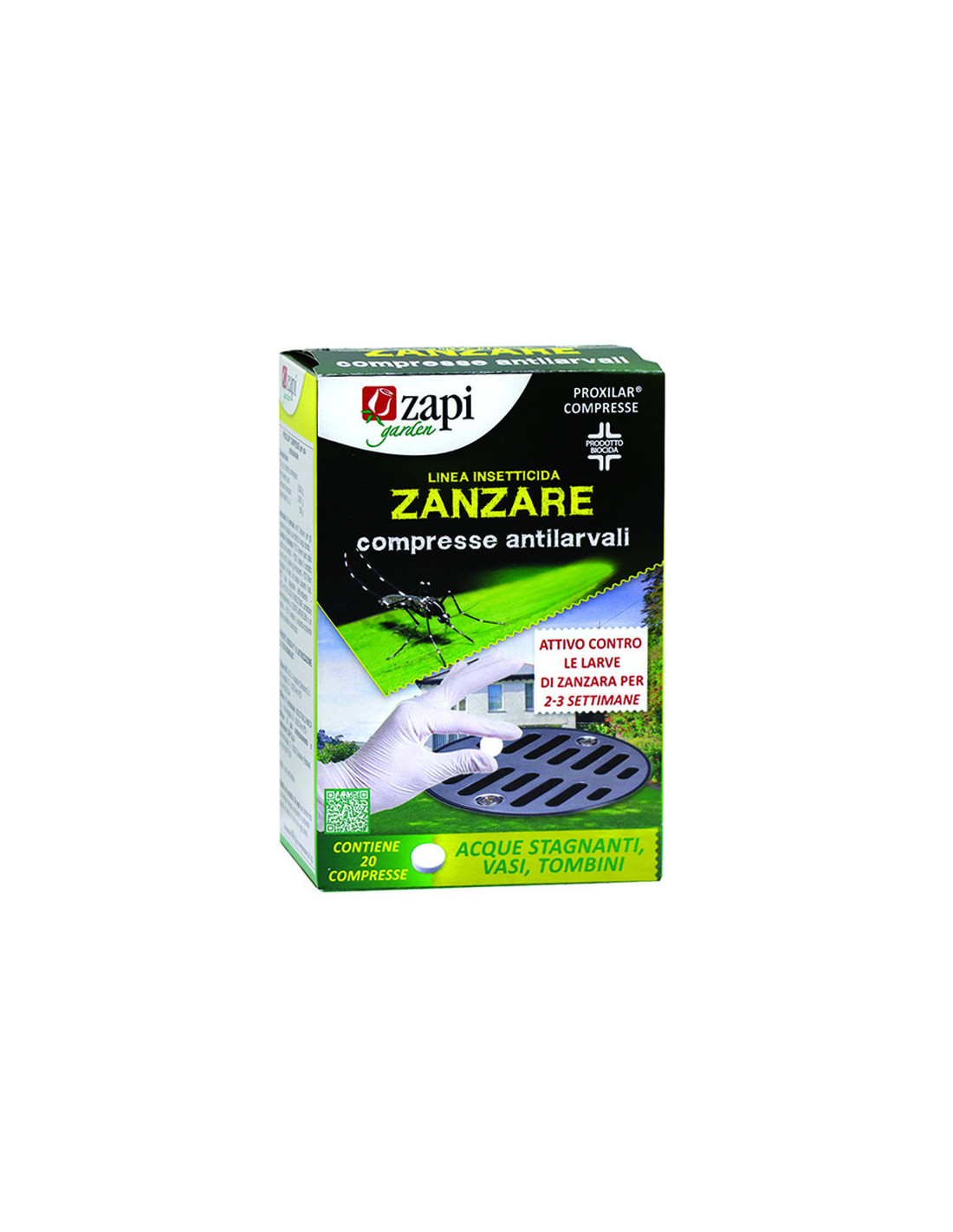 larvicida antizanzare in compresse - principio attivo pyriproxyfen - campo d'impiego tombini e caditoie o pozzetti - per la lotta contro larve di ogni specie di zanzara (tigre e comune) - modalità d'uso: 1 compressa per lt.40 di acqua circa, ripetere i trattamenti ogni 2/3 settimane astuccio gr.40