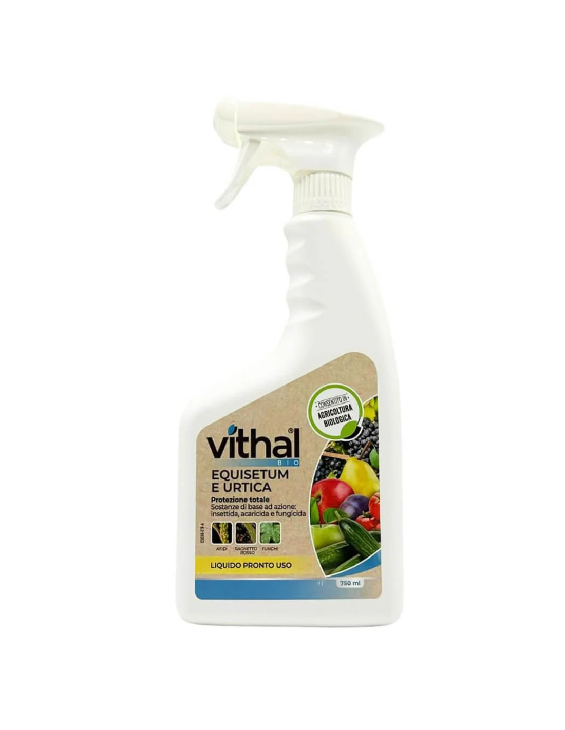Protezione totale di Vithal Bio è un prodotto pronto all'uso a base di equiseto ed ortica che sono sostanze note per le loro proprietà di insetticida, fungicida e di acaricida.