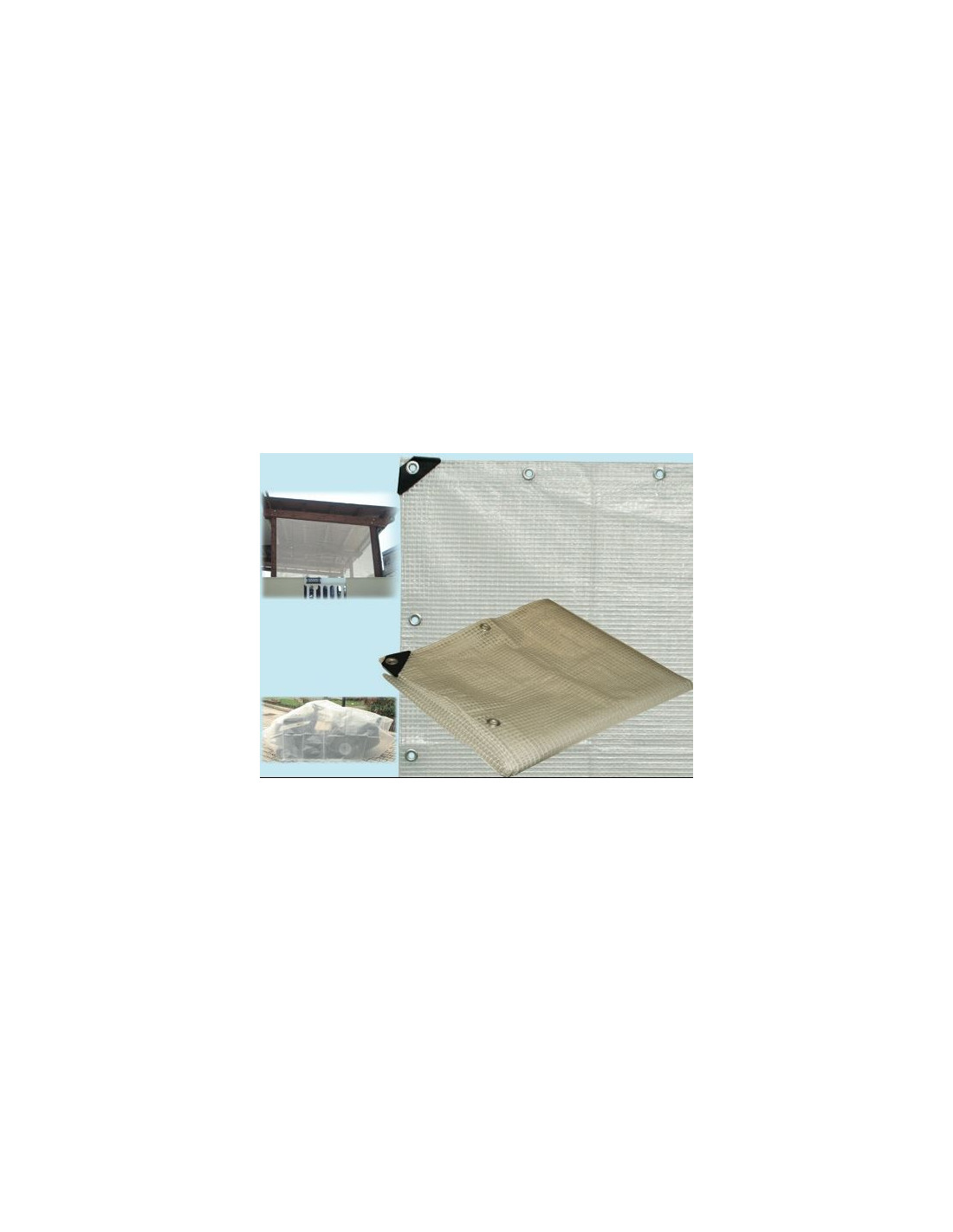 In polietilene occhiellati,rinforzato, impermeabile,resistente a pioggia e sole.
