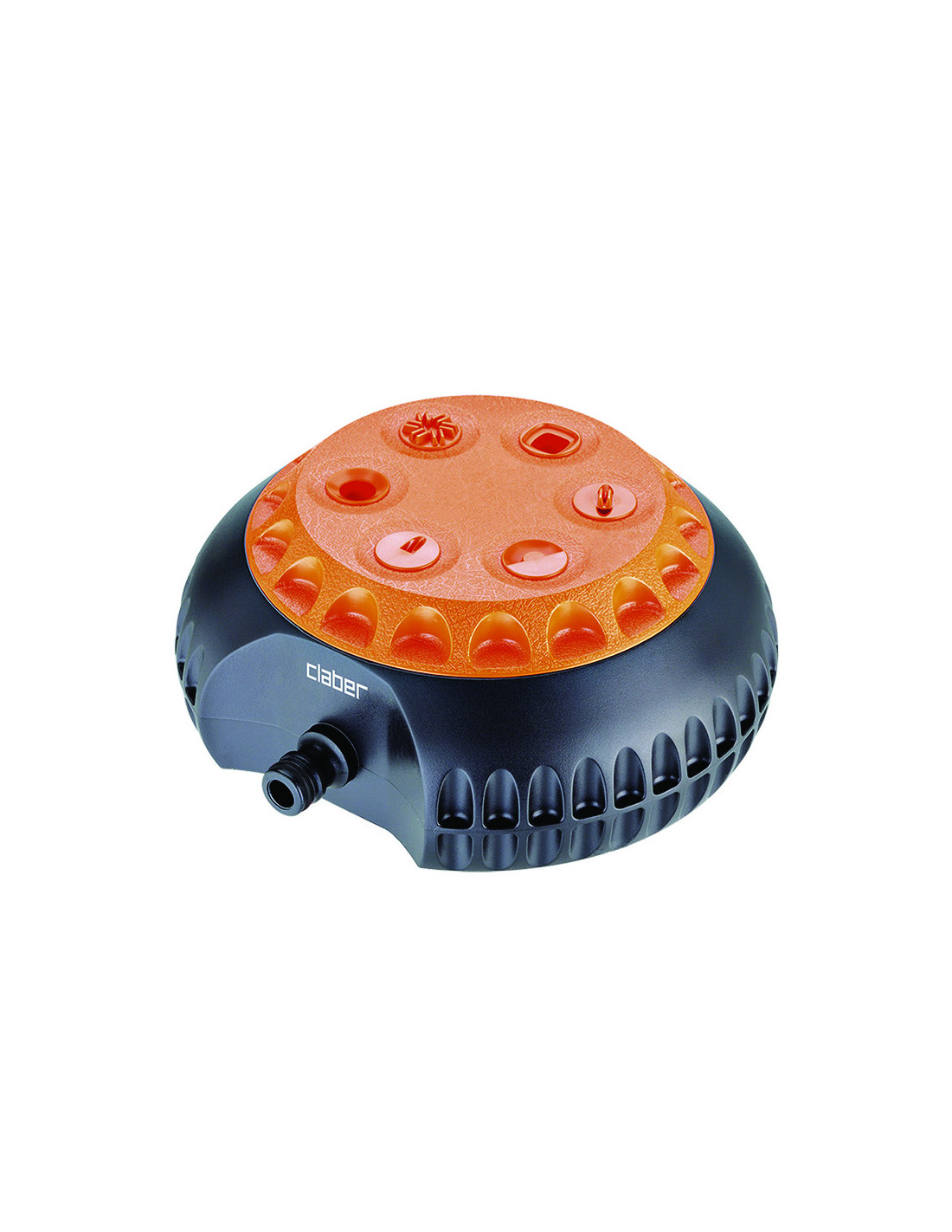Irrigatore statico multifunzione costruito interamente in ABS. La speciale forma arrotondata ne permette il facile trascinamento sul prato, tra aiuole e piante. Parte superiore sagomata per una facile presa. Ruotando la flangia si ottengono 6 funzioni diverse. Area massima irrigata 64 m²