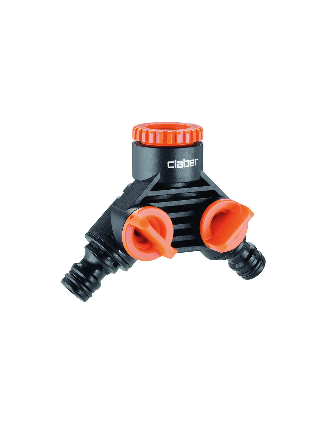 Presa a rubinetto a due vie. Consente l’allacciamento di due linee ad un’unica presa d’acqua. Rubinetti a regolazione indipendente. Installazione ad avvitamento. Filetto F da 3/4” (20-27 mm) e riduzione da 1/2” (15-21 mm).