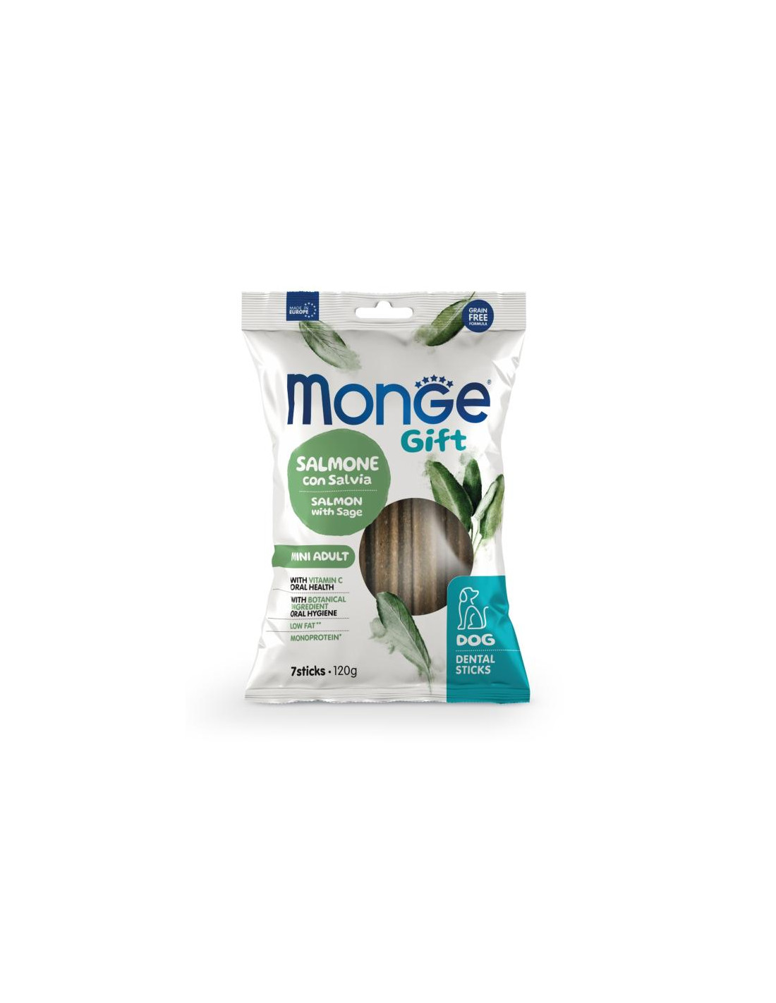 MONGE GIFT MINI DOG SALMONE CON SALVIA è un alimento complementare per cani adulti di taglia mini. Specificatamente sviluppato per il benessere del tuo cane grazie all’inclusione di fibra vegetale per una maggiore elasticità di texture e favorire la masticazione. Prodotto formulato senza cereali e con un’unica fonte proteica animale*, il salmone, preziosa fonte di proteine ad elevata digeribilità e valore biologico. La formulazione è arricchita con vitamina C per la salute del cavo orale ed è caratterizzata da un ridotto contenuto di grassi** per favorire il mantenimento del peso corporeo ideale. L’inclusione di ingredienti botanici, come la salvia utile al mantenimento dell’igiene orale, è frutto della ricerca Made in Italy per supportare la qualità di vita dei nostri cani. Senza coloranti artificiali e zuccheri aggiunti.