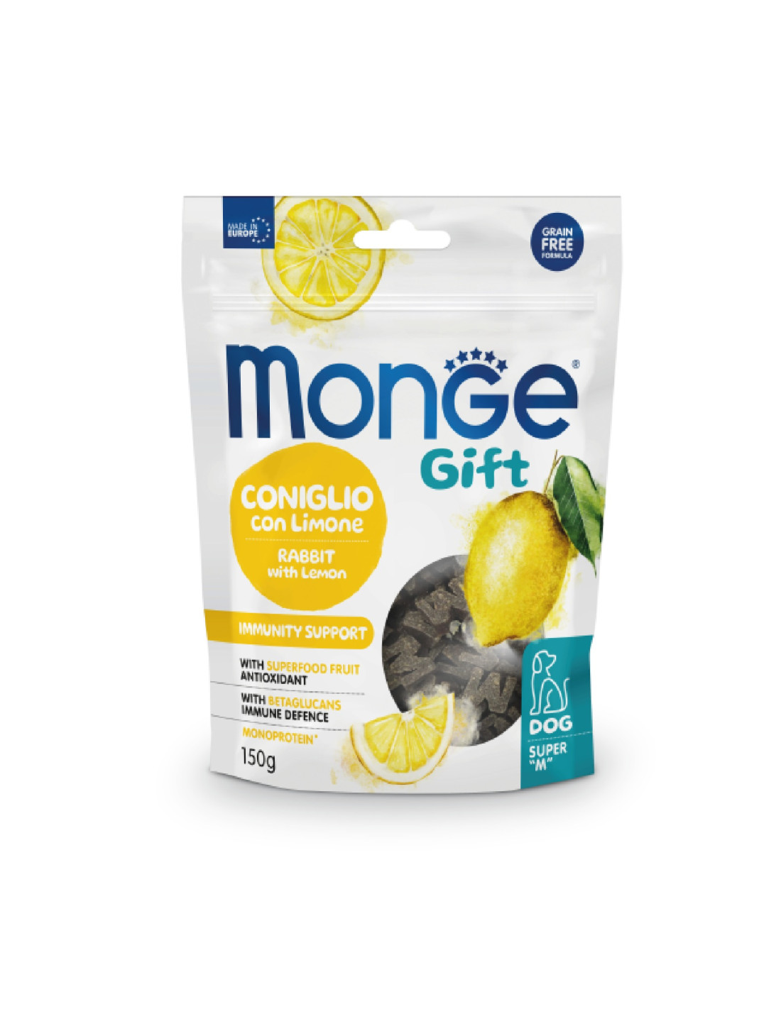 MONGE GIFT IMMUNITY SUPPORT DOG CONIGLIO CON LIMONE è un alimento complementare per cani adulti. Specificatamente sviluppato per il benessere del tuo cane grazie all’inclusione di L-carnitina per il mantenimento della massa magra. Prodotto formulato senza cereali e con un’unica fonte proteica animale*, il Coniglio, preziosa fonte di proteine ad elevata digeribilità e valore biologico. La formulazione è arricchita con vitamine per la vitalità quotidiana e con betaglucani a supporto delle difese dell’organismo. L’inclusione di frutta superfood, come il limone fonte di antiossidanti per rinforzare il sistema immunitario, è frutto della ricerca Made in Italy per supportare la qualità di vita dei nostri cani. Senza coloranti artificiali e zuccheri aggiunti.