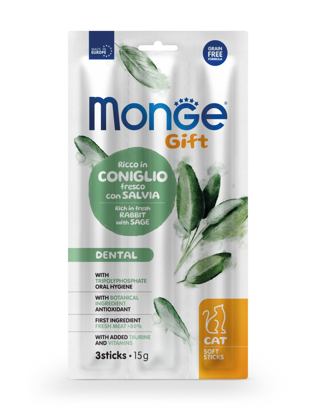 MONGE GIFT DENTAL GATTO RICCO IN CONIGLIO FRESCO CON SALVIA è un alimento complementare per gatti adulti. Specificatamente sviluppato per il benessere del tuo gatto grazie all’inclusione di tripolifosfato di sodio per il supporto dell’igiene dentale e al ridotto contenuto di grassi* per favorire il mantenimento del peso corporeo ideale. Prodotto formulato senza cereali e con carne fresca preziosa fonte di proteine ad elevata digeribilità e valore biologico. La formulazione è arricchita con taurina per il supporto alla visione e al normale funzionamento cardiaco e con vitamine per la vitalità quotidiana. L’inclusione di ingredienti botanici come la salvia, per il benessere del cavo orale, è frutto della ricerca Made in Italy per supportare la qualità di vita dei nostri gatti. Senza coloranti artificiali e zuccheri aggiunti.