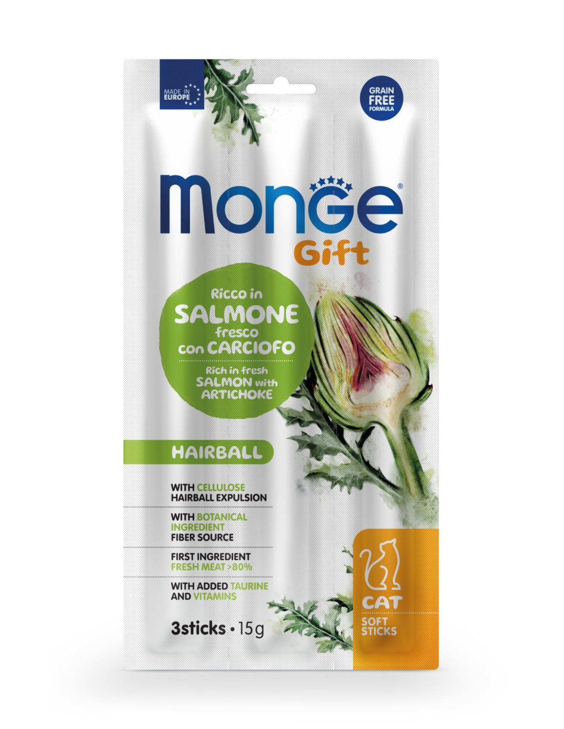 MONGE GIFT HAIRBALL GATTO RICCO IN SALMONE FRESCO CON CARCIOFO è un alimento complementare per gatti adulti. Specificatamente sviluppato per il benessere del tuo gatto grazie all’inclusione di cellulosa per favorire l’espulsione fisiologica dei boli di pelo e al ridotto contenuto di grassi* per favorire il mantenimento del peso corporeo ideale. Prodotto formulato senza cereali e con carne fresca preziosa fonte di proteine ad elevata digeribilità e valore biologico. La formulazione è arricchita con taurina per il supporto alla visione e al normale funzionamento cardiaco e con vitamine per la vitalità quotidiana. L’inclusione di ingredienti botanici come le foglie di carciofo, fonte di fibre insolubili per la regolarità intestinale, è frutto della ricerca Made in Italy per supportare la qualità di vita dei nostri gatti. Senza coloranti artificiali e zuccheri aggiunti.