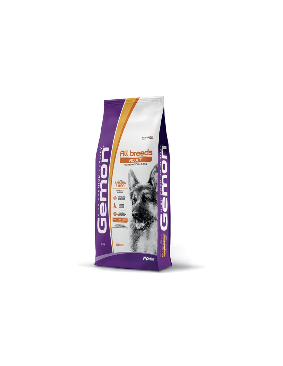 GEMON ALL BREEDS ADULT CON ANATRA E RISO è un alimento completo per cani adulti di tutte le taglie. La formulazione è caratterizzata da ingredienti di qualità come l’anatra, fonte di nutrienti essenziali, e il riso, fonte di carboidrati, resi altamente digeribili mediante il processo di estrusione. Un’alimentazione bilanciata con prebiotici, quali i fruttoligosaccaridi (FOS), e polpa di barbabietola, fonte di fibre insolubili, per la regolarità del tratto intestinale. Contiene carne fresca per un’appetibilità ottimale e con glucosamina e solfato di condroitina per il supporto delle articolazioni e delle ossa. Formulata inoltre con lievito di birra per un mantello folto e morbido e senza l’aggiunta di coloranti e conservanti artificiali.