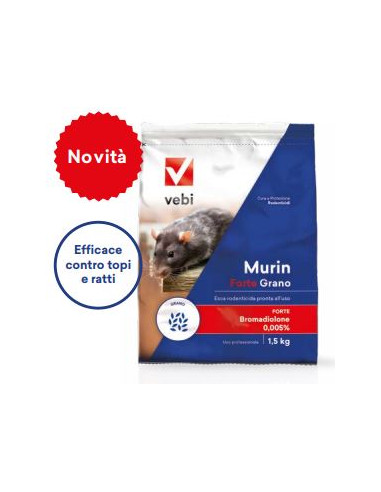 CARATTERISTICHE MURIN FORTE GRANO è un’esca rodenticida pronta all’uso a base di una sostanza attiva anticoagulante, denominata Bromadiolone, efficace contro Topolino domestico, Ratto grigio, Ratto nero anche dopo una singola ingestione.