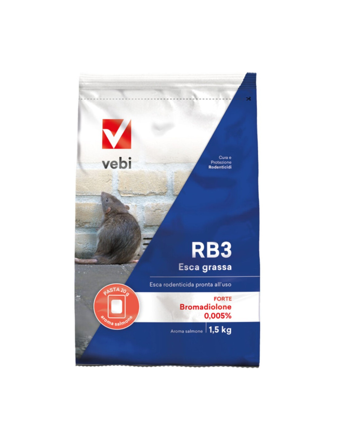 RB3 ESCA GRASSA è un’esca rodenticida pronta all’uso a base di una sostanza attiva anticoagulante, denominata Bromadiolone, efficace contro Topolino domestico, Ratto grigio